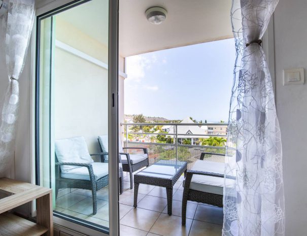 -Séjour climatisé avec canapé, téléviseur, pleine vue mer et port de plaisance, salon de jardin sur balcon.