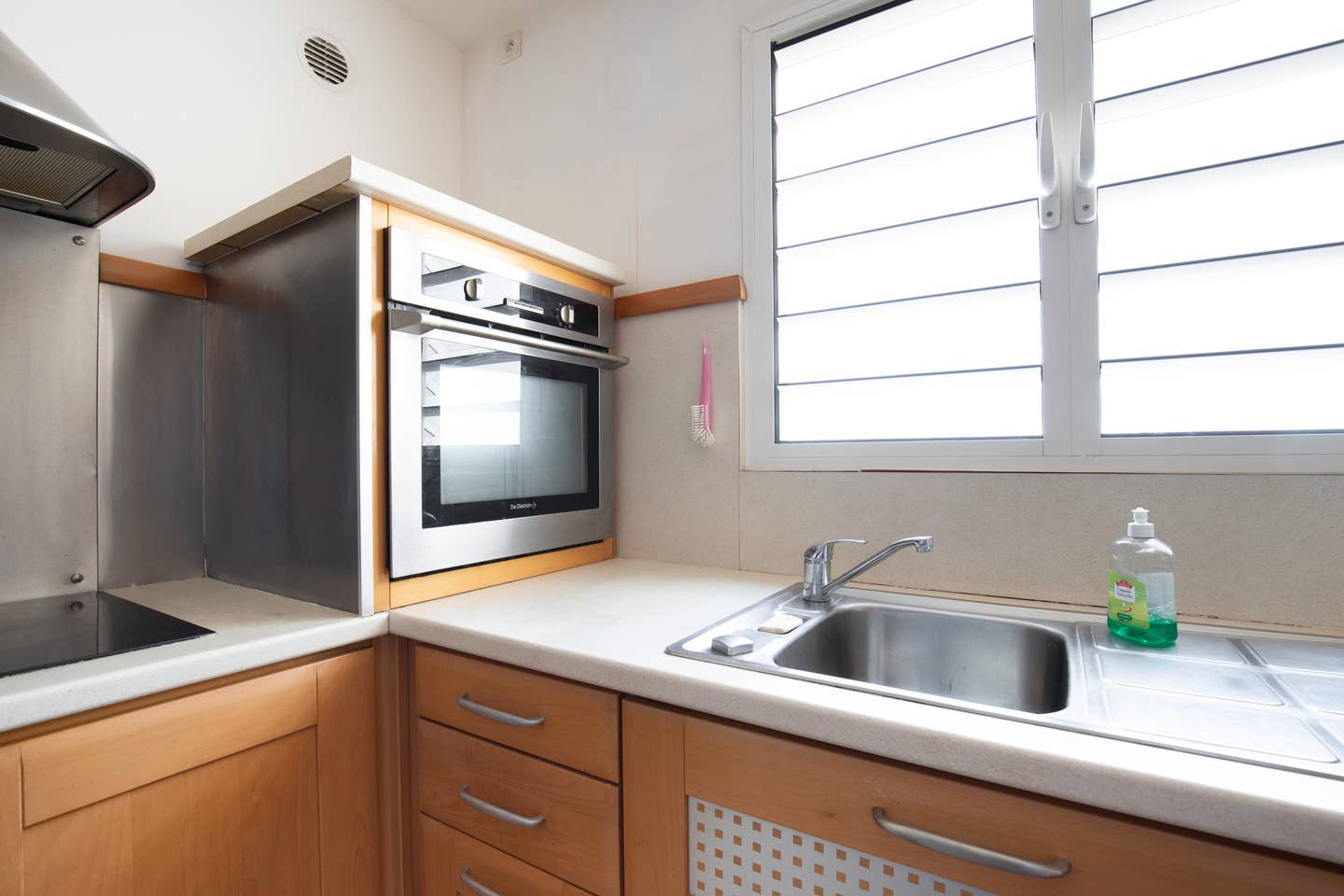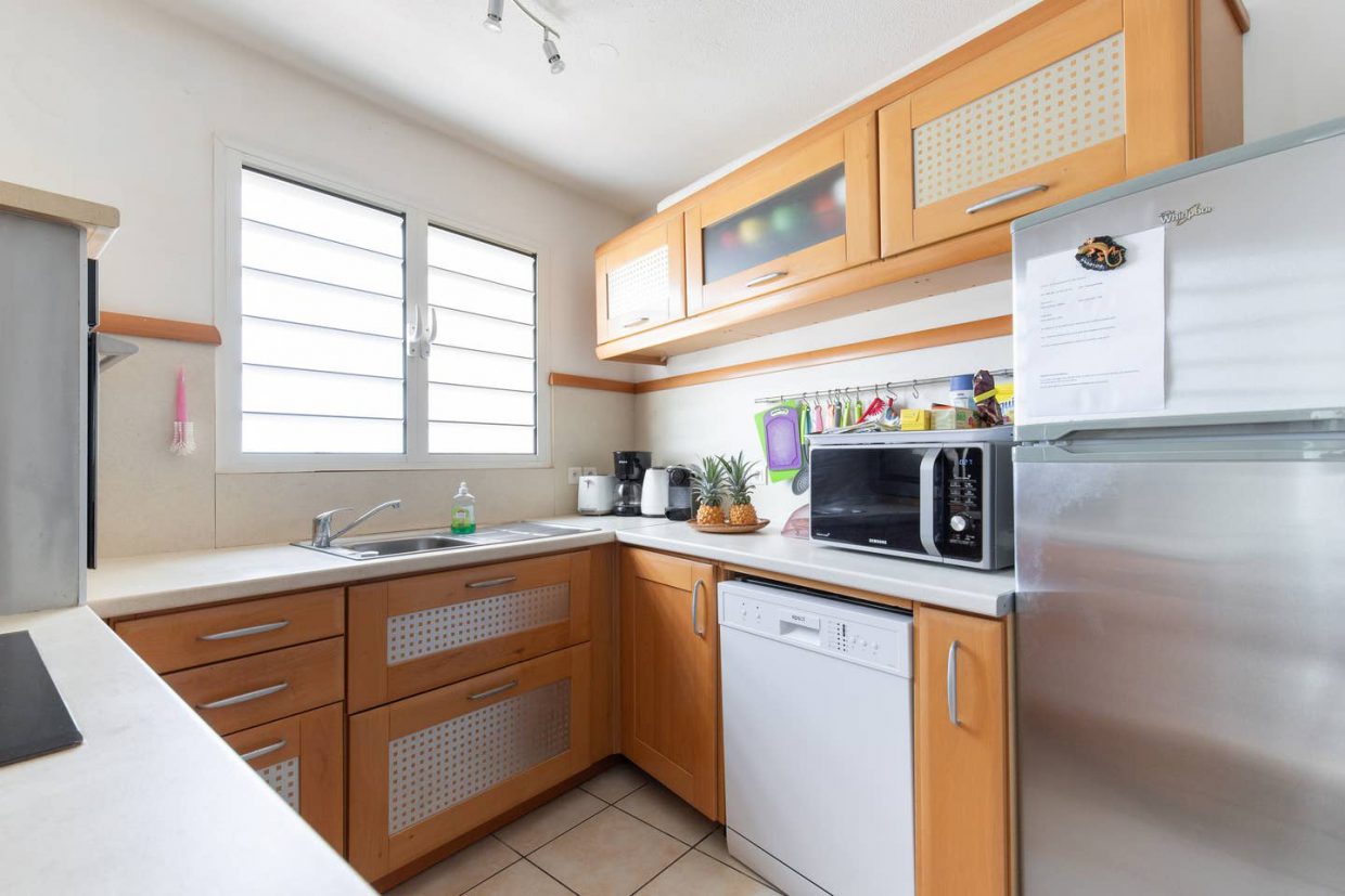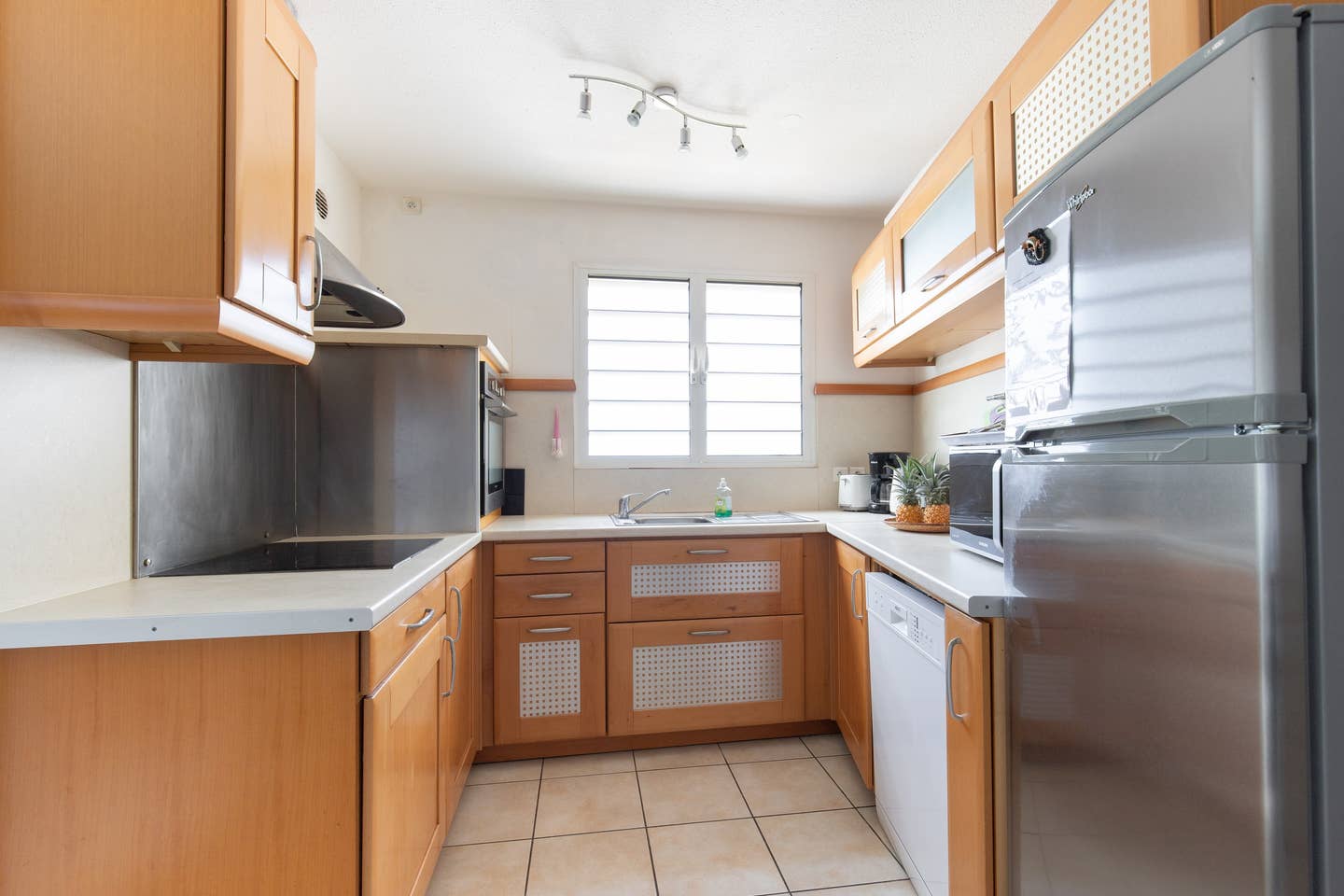 La cuisine, ouverte sur le séjour, est entièrement équipée : réfrigérateur-conservateur, lave-vaisselle, plaque de cuisson vitro céramique, four, un four micro-onde, cafetière, grille-pain, bouilloire, cuiseur riz ainsi que tout le nécessaire de cuisine.