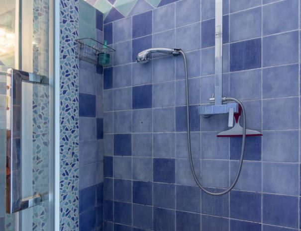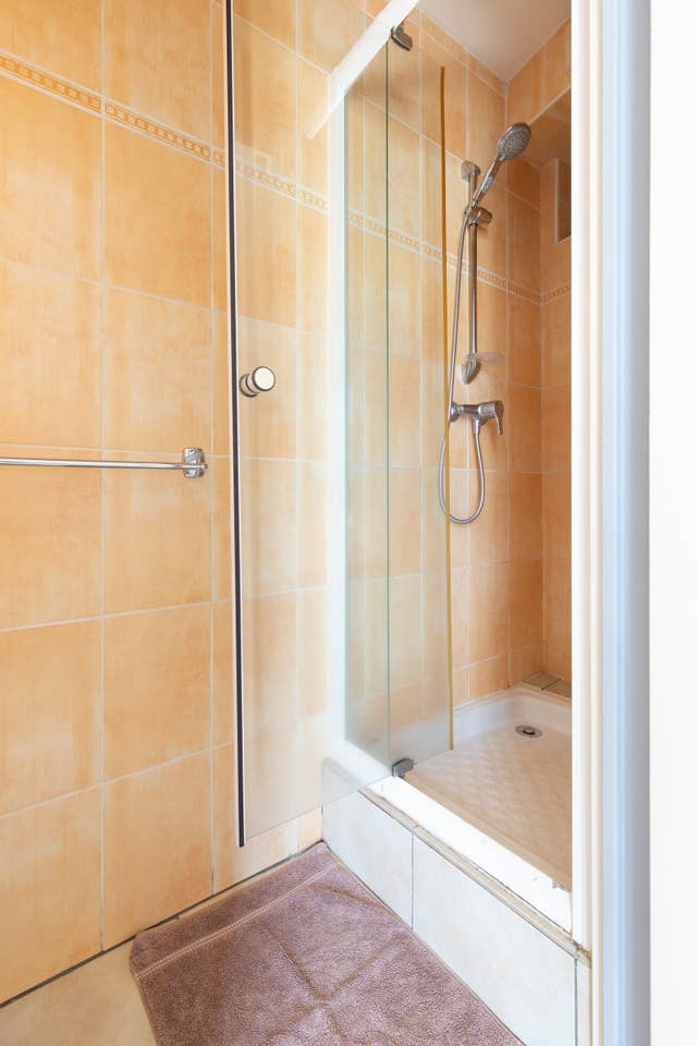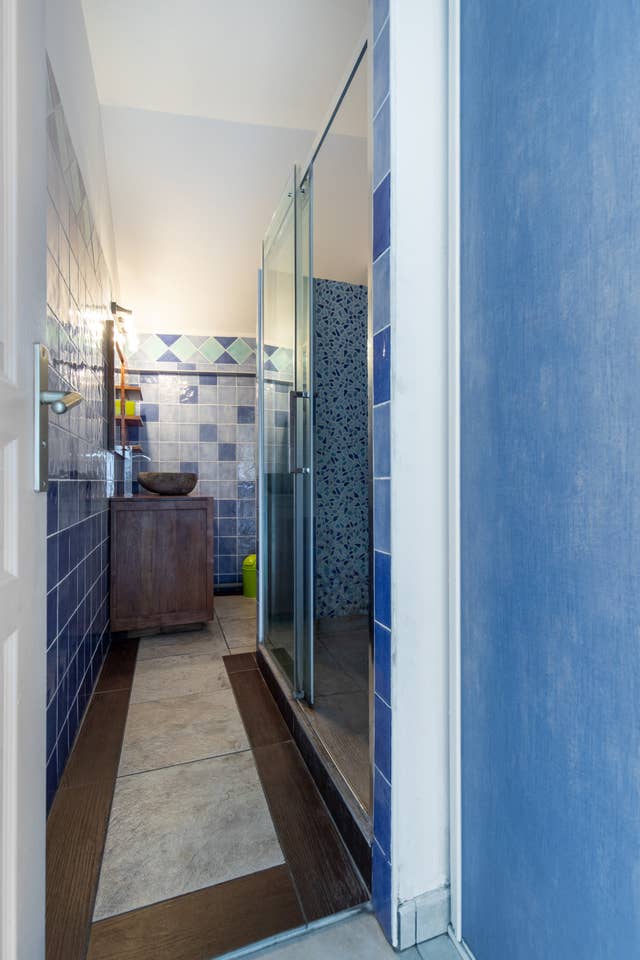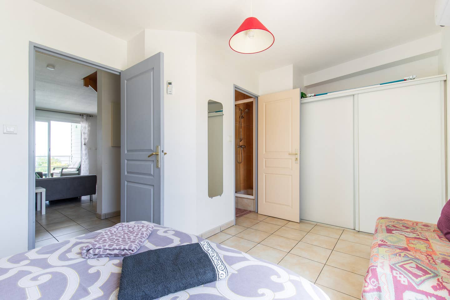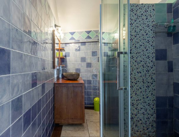 -1 grande chambre climatisée avec lit 140*190 au rez-de-chaussée avec balcon et 1 salle d’eau attenante (meuble vasque+douche.